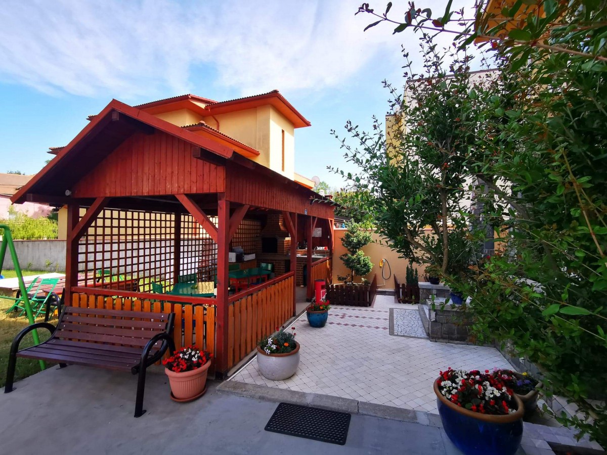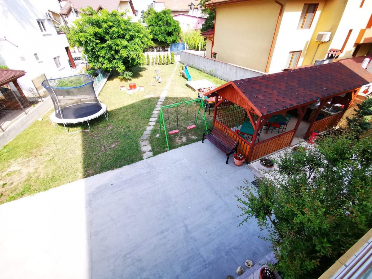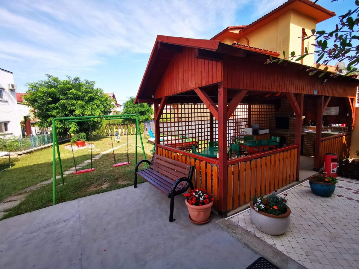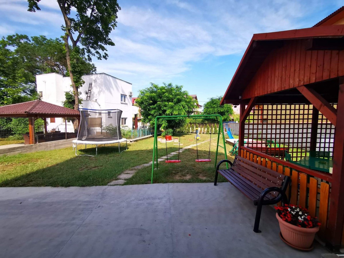 In curte este amenajat special pentru copii un loc de joaca cu topogan, balansoar, trambulina si leagan, iar pentru cei mari, foisor cu gratar-barbegue si acces la bucatarie pentru minuturi. Vila dispune de parcare auto.