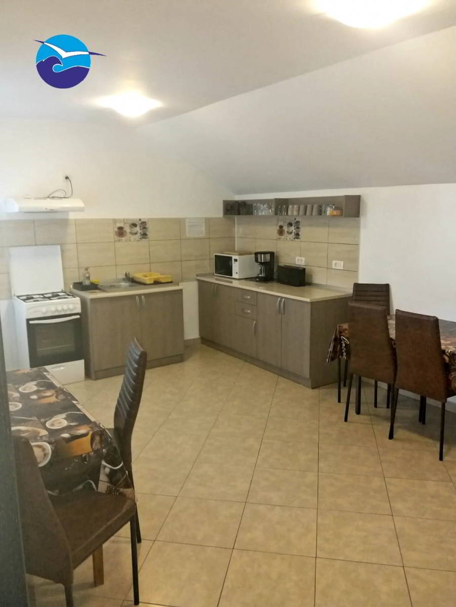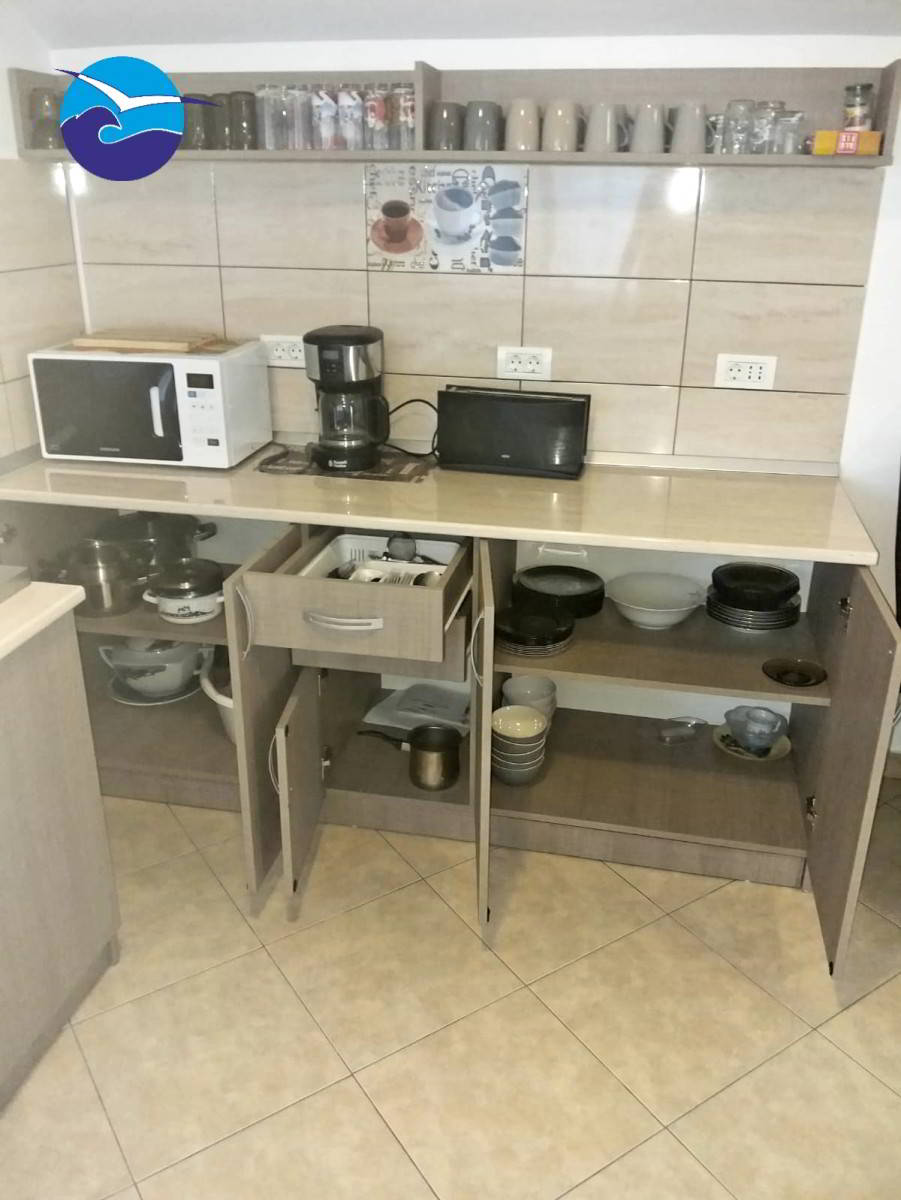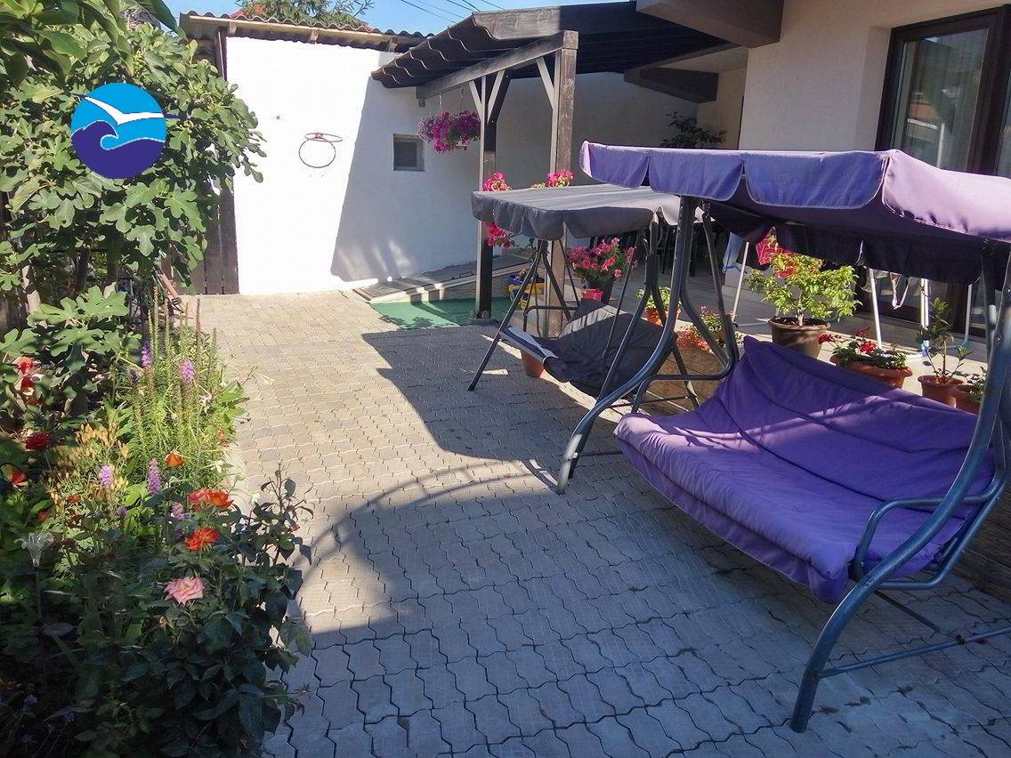 Locatia beneficiaza de o bucatarie de oaspeti utilata complet (aragaz, cuptor microunde, aparat cafea, vesela yena, tacamuri) cu 12 locuri la et. 2, curte cu terasa 8 locuri, balansoar, loc fumat (bancuta cu scrumiera picior), iar separat este un spatiu de joaca pt copii.